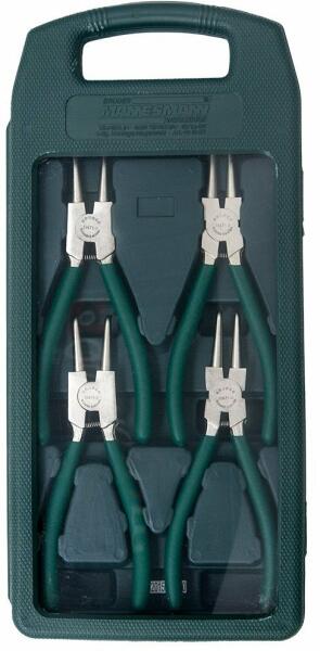 Fogó a biztosíték gyűrűkre  Mannesmann német gyártótól.   A kiváló minőségű anyagok és a kezelési pontosság megfelel a DIN 471 és 472 normának. Tulajdonságok: - a fogók  minőségi edzett  acélból készültek,   rozsdamentes króm  réteggek bevonva, utólagosan fényezett - magas terhelésnek és kemény munkának ellenáll -a gyűrűk lazítására és szétszerelésére szolgálnak 19-60 mm tartományban - a hosszú karok  lehetővé teszik a nehezen elérhető helyek hozzáférését a fogantyúk csúszásgátló felületű erős műanyagból készültek - a fogók egy hordozható praktikus dobozban vannak elhelyezve, mely felakasztható SZETT TARTALMA: Lapos fogók a biztosító gyűrűkre - 170 mm hosszú Fogók a külső biztosító gyűrűkre - 90 ° fokban hajlított, 180 mm hosszú Egyenes fogók a biztosító gyűrűkre - 170 mm hosszú Fogók a belső biztosító gyűrűkre - 90 ° fokban hajlított, 180 mm hosszú Praktikus műanyag tok