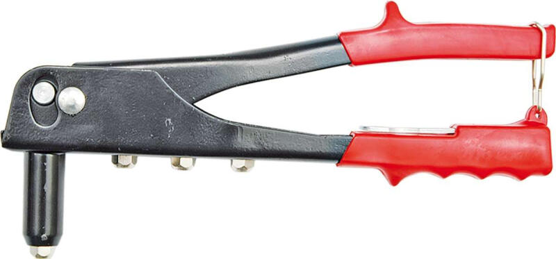 Szegecshúzó - kézi, használata szegecsanyák 2,4, 3,2, 4 és 4,8 mm átmérővel, szegecsek anyaga acél, csúszásgátlós markolat, hossza 240 mm, tömege 0,5 kg